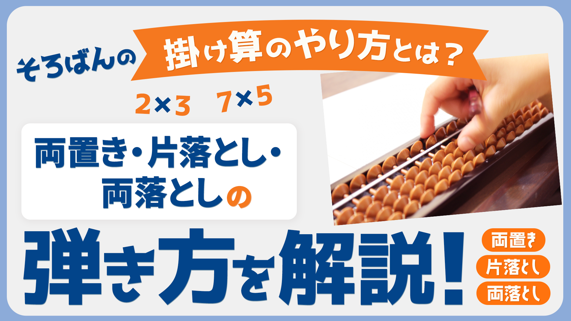 そろばんの掛け算の弾き方は、掛けられる数(実)と掛ける数(法)の置き方により、「両置き」「片落とし」「両落とし」の3種類に分けられます。